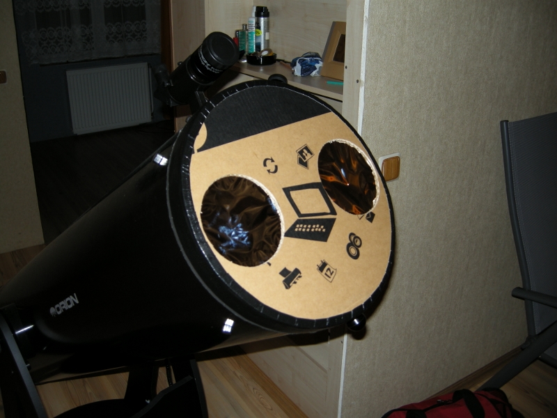 Sama kile,mis link sul siin oli.Papist lõikad välja ja liimid kokku.Pva ei tahtnud seda kilet hästi liimida,seepärast panin kileteibi veel hoidma.Jälgi kindlasti,et kile oleks korralikult kinni.Ühest august on tegelikult küll,kui sul on refraktor,tee see auk keskele.Siin foorumis on Mardil piltidega kirjeldus selle meisterdamisest.