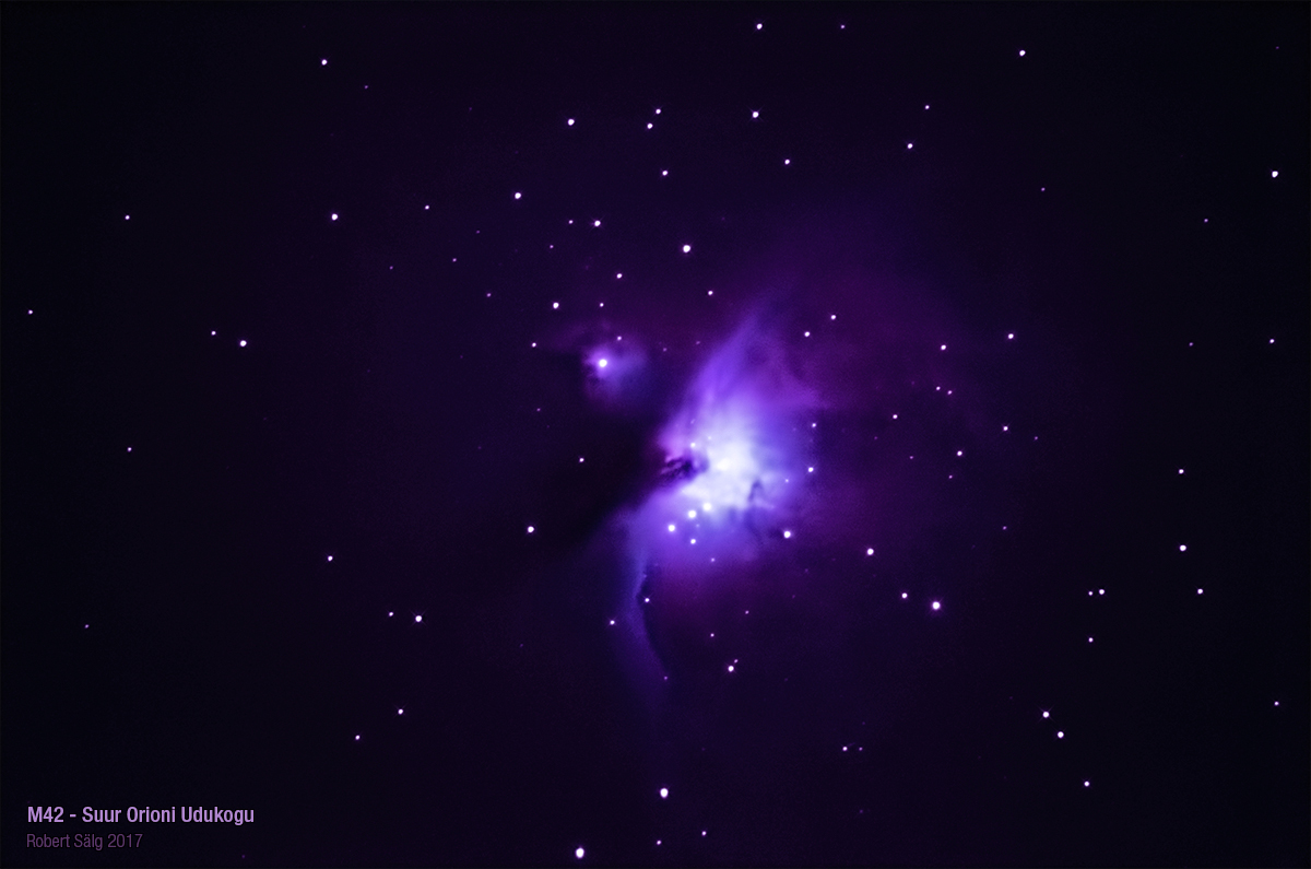 Esimene katsetus trackimata teleskoobiga mõnda süvakosmose objekti pildistada.Sättisin kraami valmis täiskuu ja veenuse pildistamiseks, aga pulli pärast tegin ka terve hunniku pilte m42'st. Igatahes peale 30 pildi stackimist DeepSkyStacker'is ja väikest töötlemist sain sellise tulemuse :D