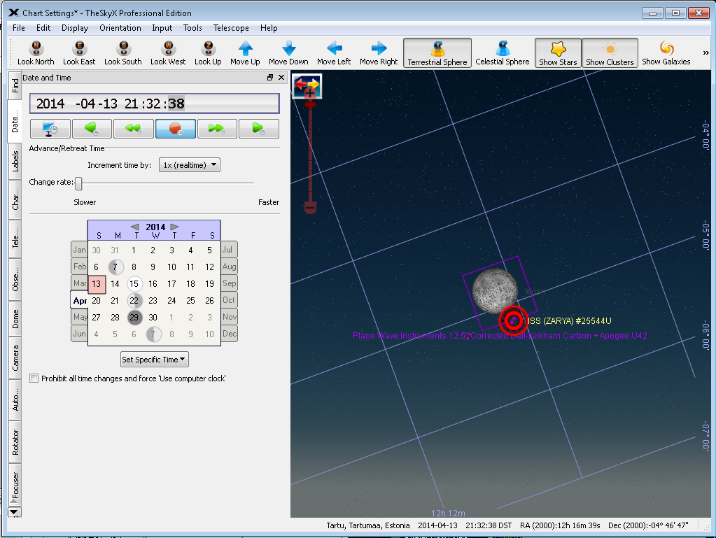 Tervist! Tõraverest vaadatuna möödub ISS Kuust õige pisut altpoolt. Pildil oleva lilla ristküliku mõõdud on 37x37 kaareminutit, see tähistab robotteleskoobi vaatevälja. Ca 21 kaareminutit (1 kaareminut = 1 miil) e. ca 34 kilomeetrit lõuna pool peaks ISS aga kenasti üle Kuu keskkoha sõitma. Ülelend peaks kestma 1.5 sekundit. Juuresoleval pildil olev kellaaeg on Tõravere jaoks õige, kuid muutub mõnevõrra siia-sinna erinevatel pikkuskraadidel.