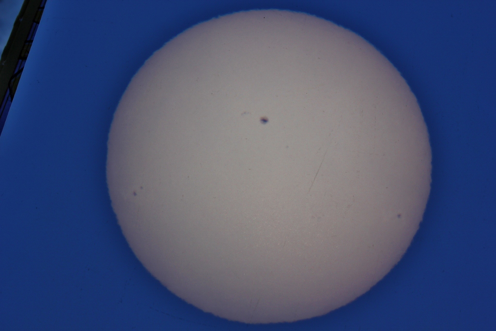 Muuseas,praegu päikesel plekk ka suurepäraselt ilma suurendamata näha.Mina vaatasin läbi keevitusklaasi.Asub ta praegu ülemises kolmandikus,kella 12 peal.